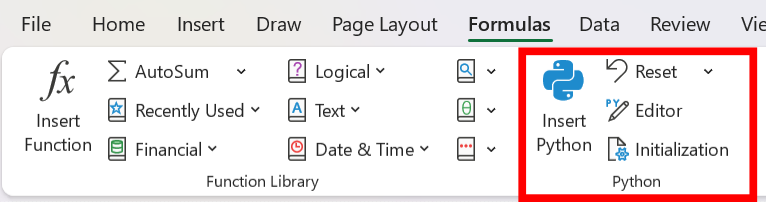 in a cell, or look for the “Python” button in the “Formulas” tab.
